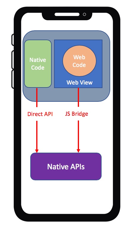 Hybrid apps use the mobile devices WebView or a customer container to emulate native behavior with web technologies. They use a Javascript API bridge to access native mobile APIs. Application components are typically developed with common web technologies such as HTML5 and JavaScript. They can be built using several development frameworks